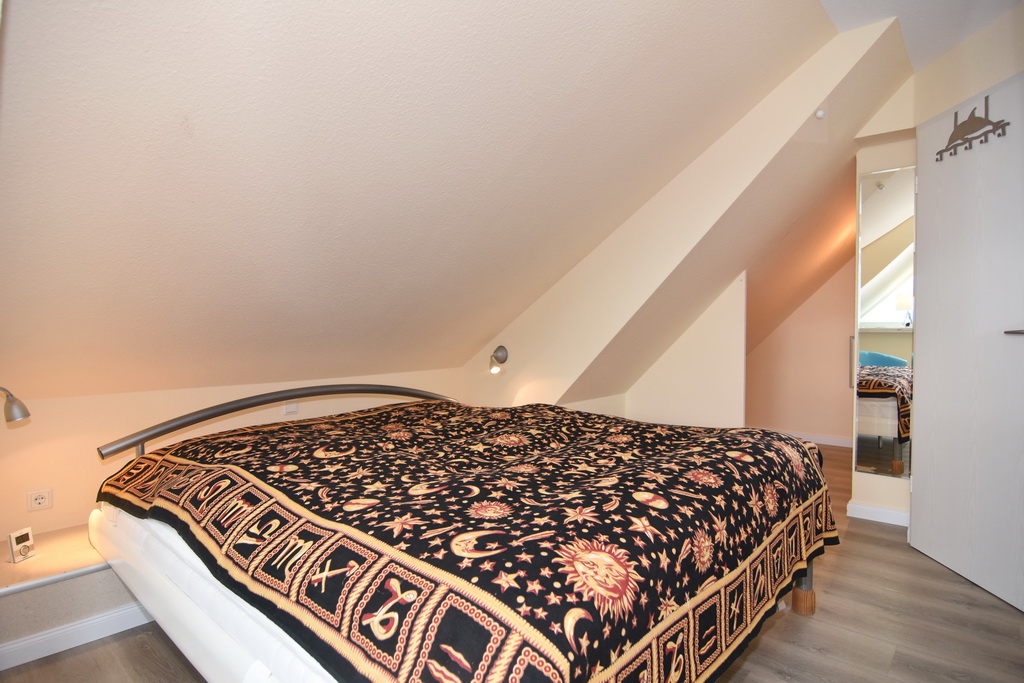 Das Schlafzimmer mit Doppelbett (180x200), TV und Kleiderschrank ist hell und freundlich und bietet ausreichend Platz für ein zusätzliches Kinderbett. Abgerundet wir das ganze durch ein modernes Duschbad / WC.